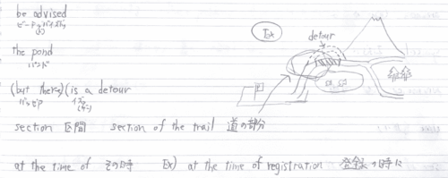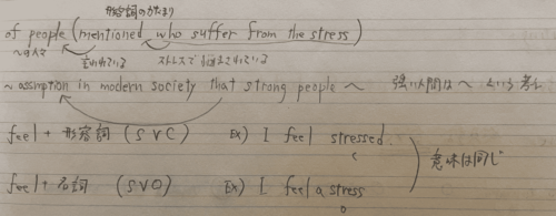 問題によって、英文の意味は分かるものの、場面をイメージしづらいものがあり、図を書いたりすることもありました(学習時のノート抜粋1参照)。場面がイメージしづらい内容は理解しにくい、または理解できていないものが多いです。もし、そのような英文があった場合は、図や絵を描いて内容を整理することをお勧めします。